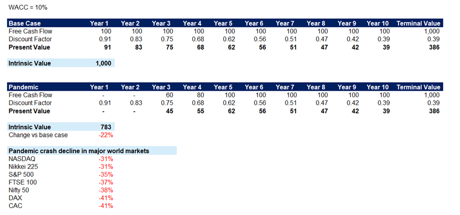 We constructed a simplified view of the stock market (Exhibit 1)- where we compare how the pandemic-led disruptions would impact future cash flows of the market in aggregate. We found that even if the pandemic resulted in no cashflows for 2 full years and if it took 5 years for full recovery, it would lead to a decline of about 22% in intrinsic value vs base case. Even with such pessimistic assumptions, the decline is far from how markets reacted during that phase. Some basic financial modeling would have given long-term investors the confidence to "buy the fear". Using this template provides investors a simple yet powerful tool to finding lucrative entry and exit points in the stock market.